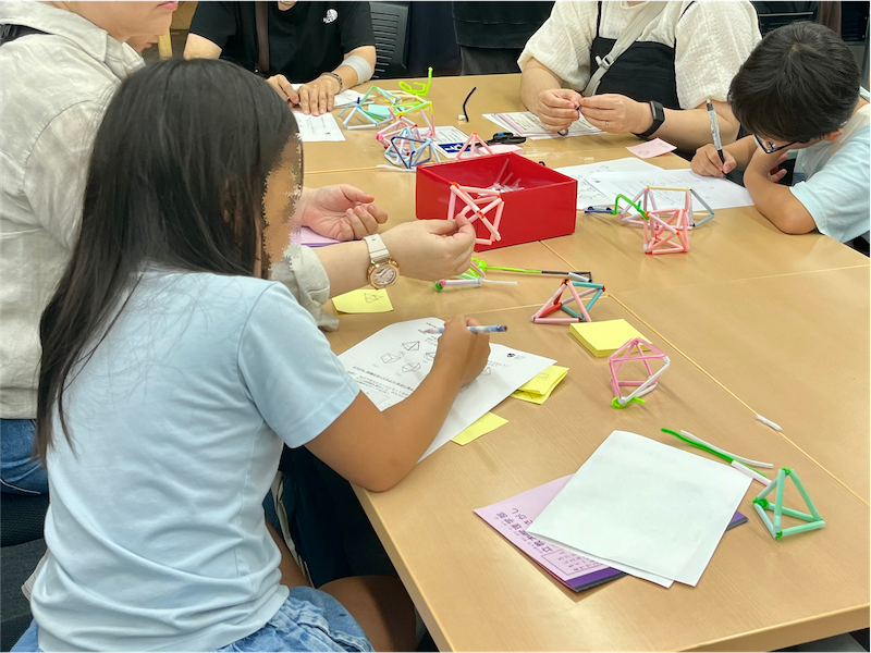この写真は、モールとストローで参加者自らが立体図形を作りながら、一筆書きができるかどうかを考えている様子です。