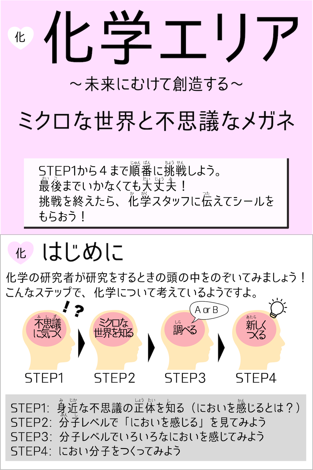 そしてそのにおい物質を不思議なメガネを通してみることで・・・いよいよ化学のミクロな世界へと入っていきます(STEP1)。
