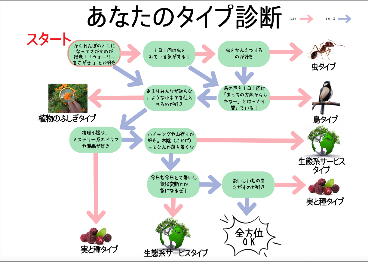 その人のタイプ(虫タイプや鳥タイプなど)毎にあった樹木の観察ポイントを写真パネルで紹介したり、