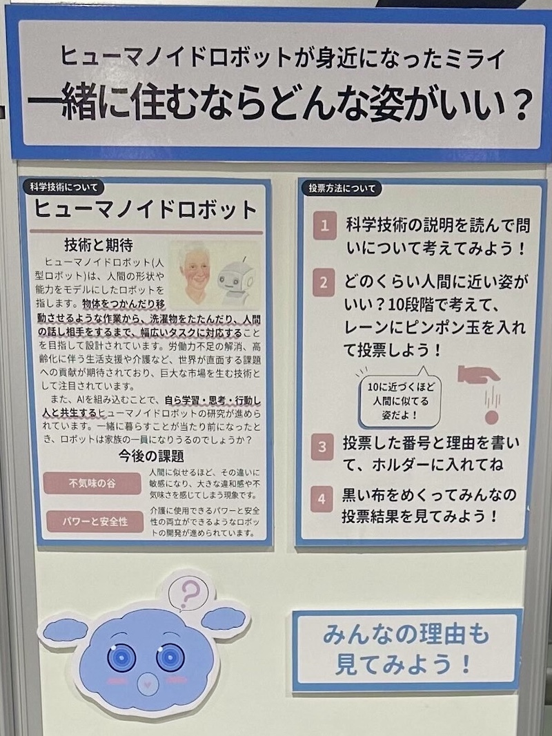 この問いでは、一緒に住むヒューマノイドロボットの姿は、①「完全に機械」〜⑩「人間と見分けがつかない」までの10段階のうちどれが良いかを選んで、ボールを箱に入れることで投票していただきました。