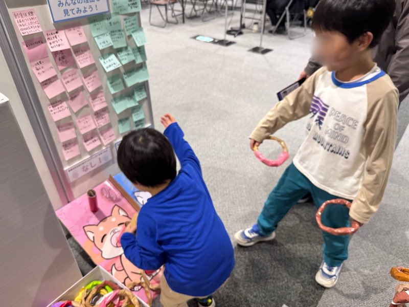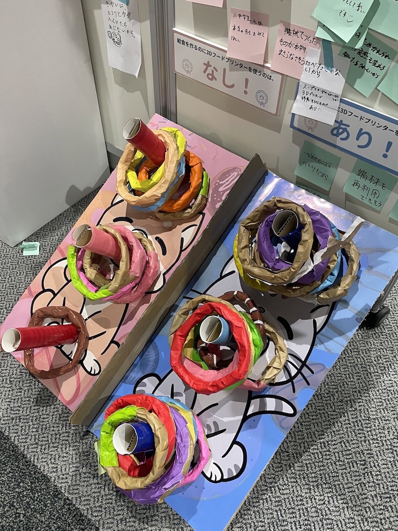この問いでは、ドーナツに見立てたリングで輪投げをすることで、どちらの立場であるのかを投票していただきました。子どもたちにとって身近な給食を取りあげ、さらに輪投げで投票するということで、小さな子どもから保護者まで幅広い世代で一番人気の投票となりました。