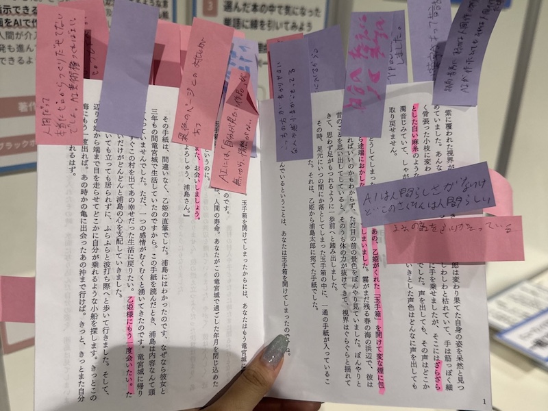 このブースでは、『浦島太郎の後日談』を人間が創作したものと、AIが生成したものの2冊を並べ、まず来場者に実際に読んでもらいました。