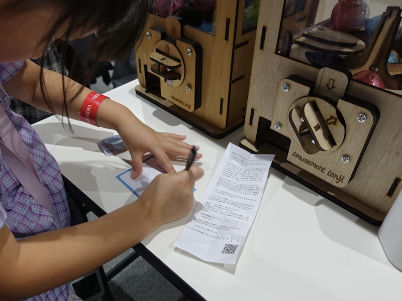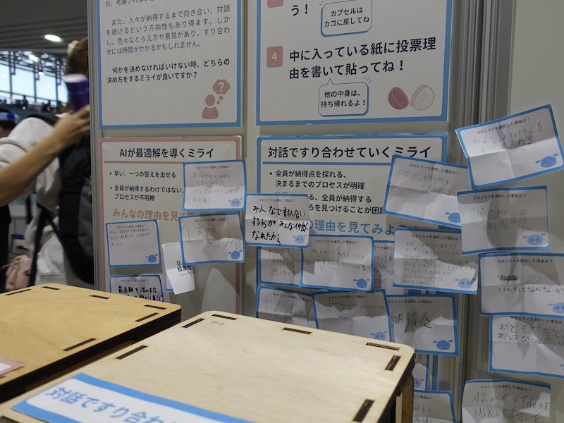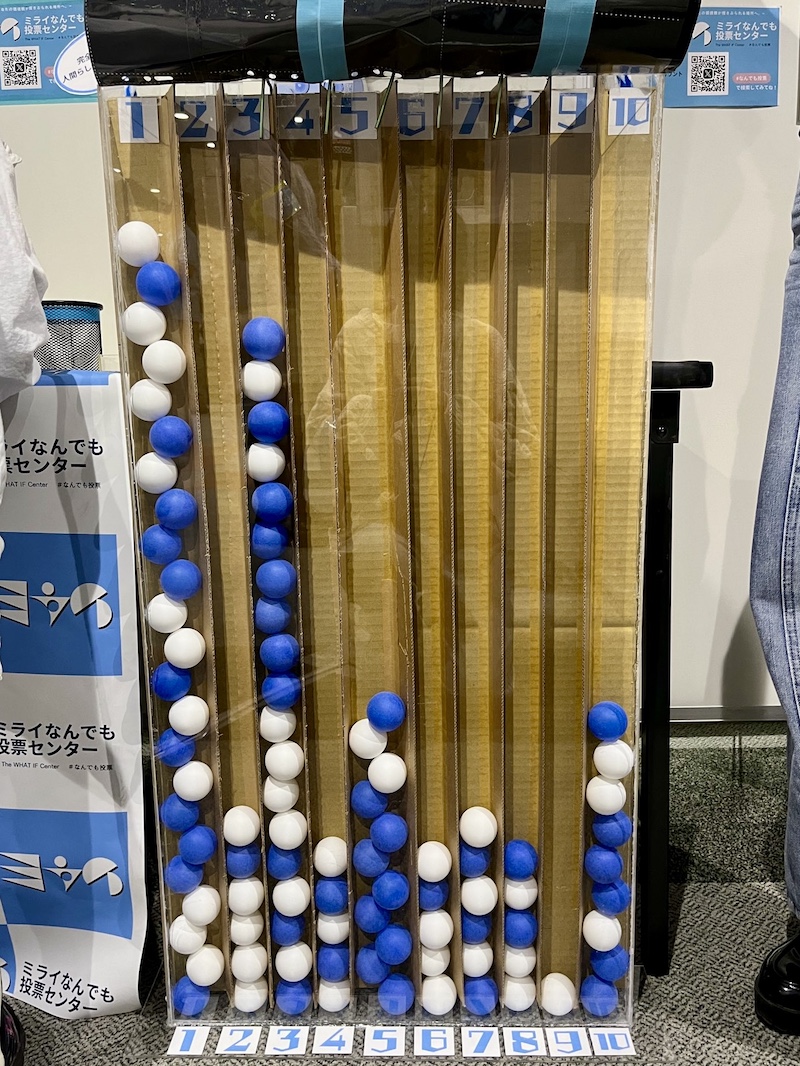 最後の投票は、個別の科学技術そのものではなく、未来における“ものごとの決め方” をテーマにしました。来場者には、ガチャガチャを回すことで投票していただきました。