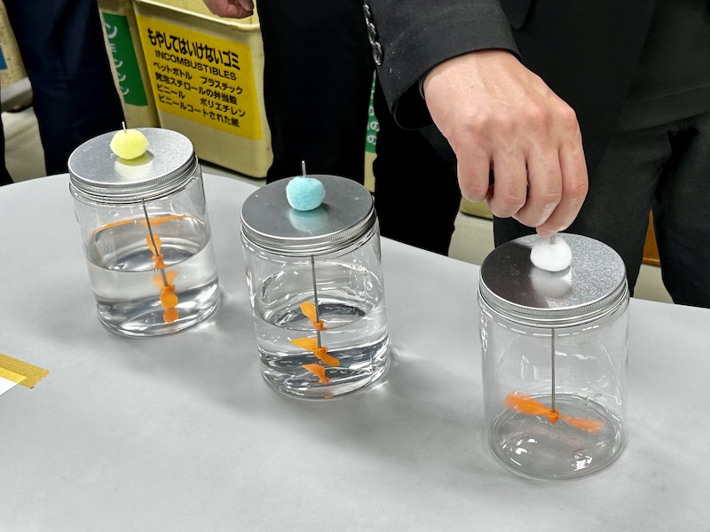 この写真は知見Aの体験で、からっぼの容器と2種類の溶液の中で、それぞれプロペラを回し、空気、水、洗濯のりで、プロペラの回しやすさが変わることを体感しました。