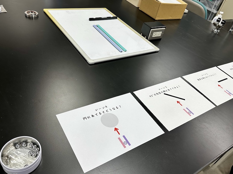 2本のマグネットバーで作ったレーンに鉄球を走らせて、目的とするモノにあてて跳ね返り方を観察します