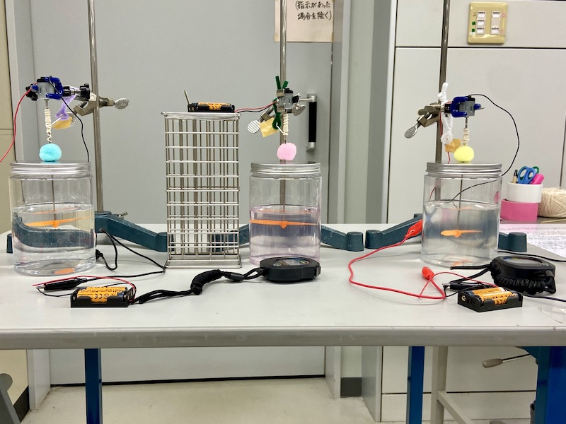 各グループで実験装置のアイデアを発表した後で、実際に実験装置として組まれたもので実験をしました。