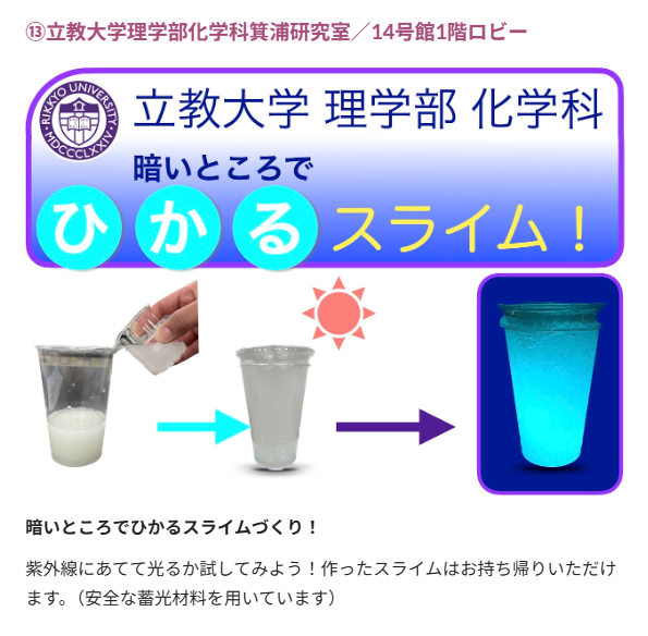 理学部化学科も「暗いところでひかるスライムつくり」を14号館1階ロビーで行います